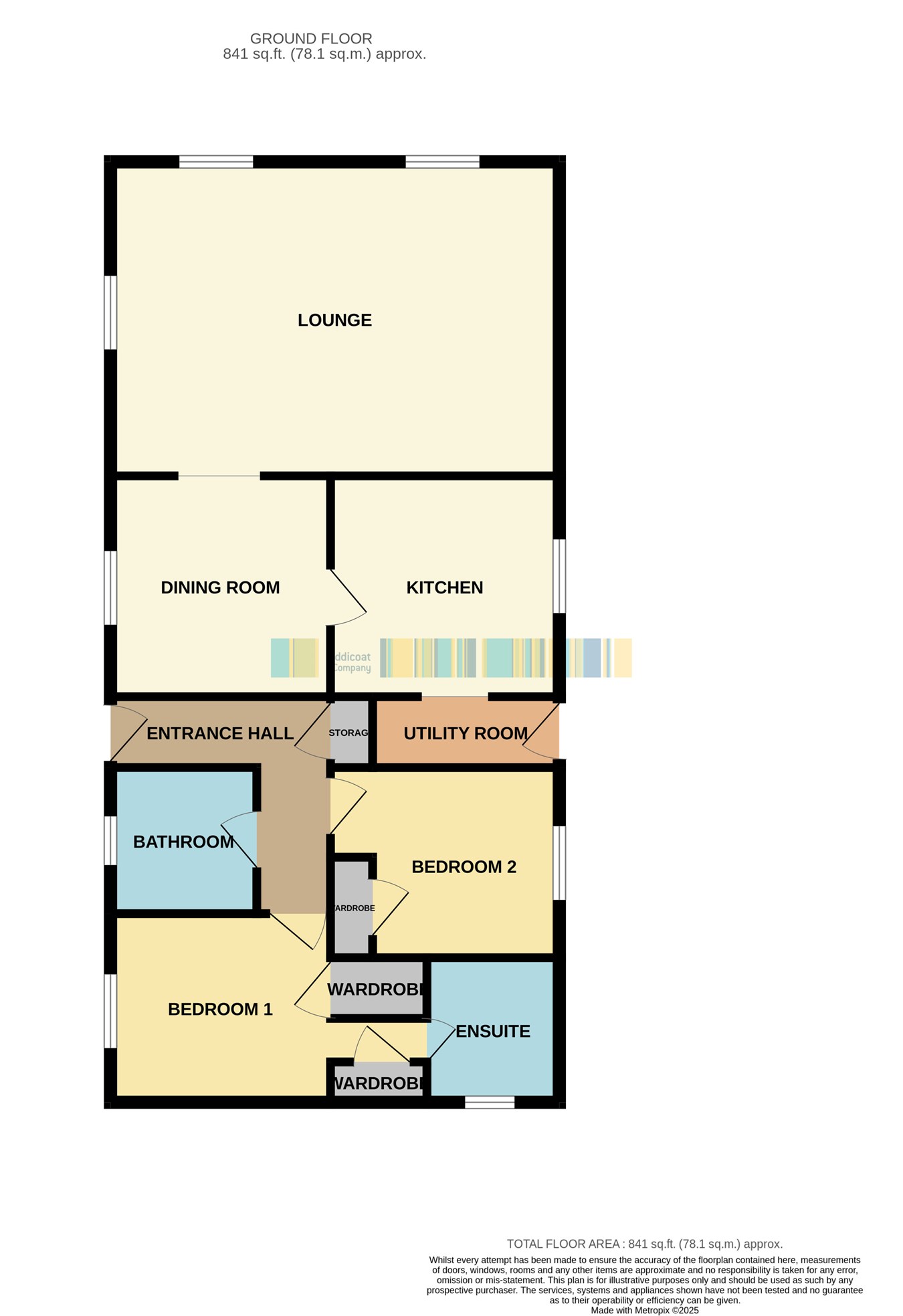 6' 5" x 6' 4" (1.96m x 1.93m) Vanity unit with basin and cupboards below, low level W.C. towel radiator, wall mounted storage cabinet, walkin mains shower, useful vertical shelved area, window to the front, low voltage lighting.