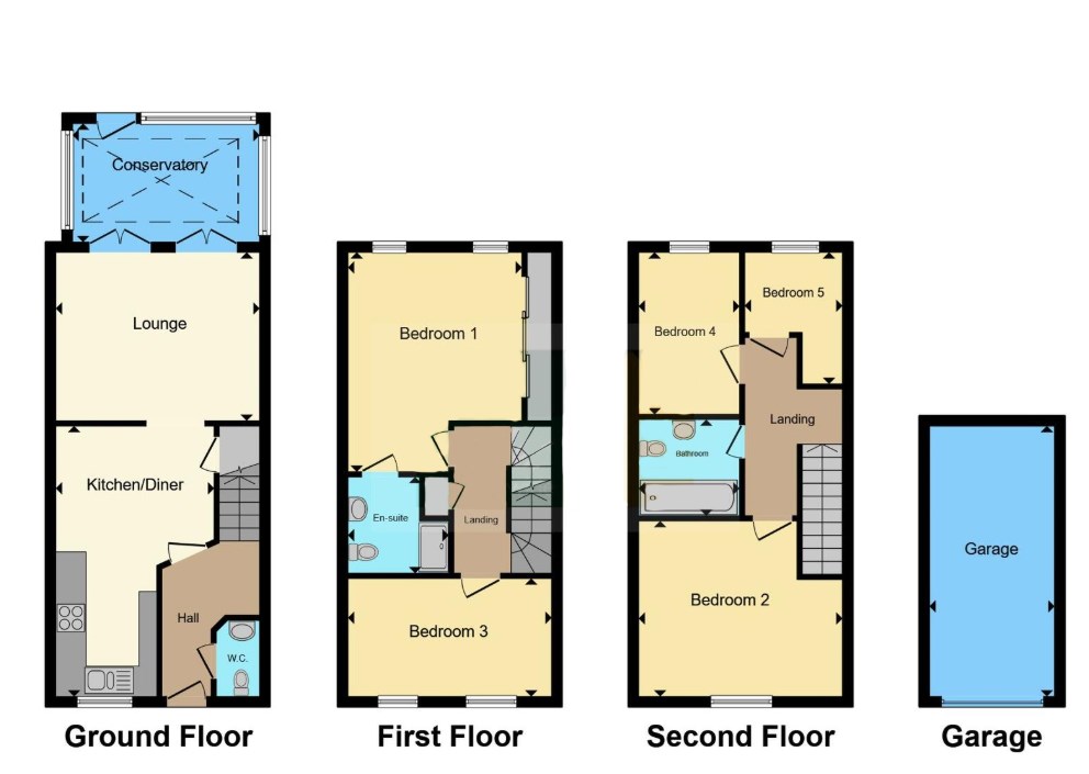 This property provides for accommodation on three floors and in brief comprises of entrance hall, cloakroom, kitchen/dining room, lounge, conservatory, 4/5 bedrooms, bathroom and en suite shower room. Outside a garage situated under a coach house, rear garden with gravelled area, timber decking and artificial lawn area. There is side access to the garden and steps leading to an allocated parking space to the rear.